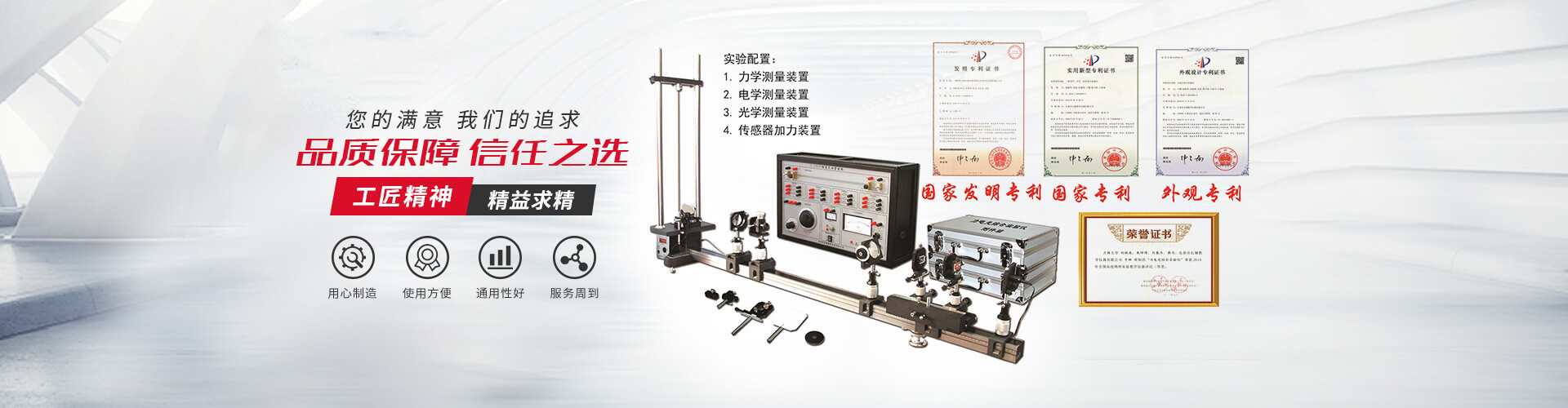 公司申报的国家zhuangli产品大型光学综合设计性拓展性实验系统、数显杨氏模量测定仪等三十余项产品获批准,其中力电光综合实验仪获得国家发明zhuangli,同各高校老师共同研制的流水式核磁共振实验仪等十余种产品相继在全国高校物理实验仪器评比中获得荣誉(十项一等奖、九项二等奖、十项三等奖),其中流水式核磁共振实验仪更是被中科院计量院认购,并评选2020年中国高等教育博览会“校企合作 双百计划"典型案例。